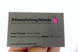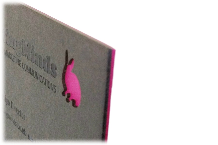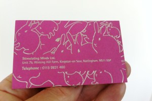 Het Engelse design & marketing communicatiebureau Stimulating Minds ontwierp dit visitekaartje voor eigen gebruik. Colorplan van GF Smith geeft ze de mogelijkheid twee of meer kleuren te combineren tot een vel karton. In dit geval werd dat een combinatie van Fuchsia Pink en Dark Grey. Het symbool werd in de grijze kant uitgestanst zodat het Funchsia Pink er mooi doorheen te zien is. Bedrukking in twee kleuren folie.