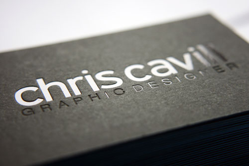 De Engelse vormgever Chris Cavill selecteerde Colorplan/Duoplan in de kleurcombinatie Ebony met Tabriz Blue voor zijn visitekaartje. Bedrukking met een blind embossing en mat zwarte folie.