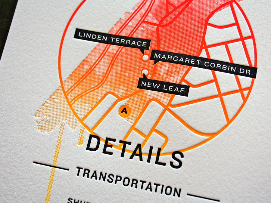 Douglas Behl ontwierp de uitnodigingen, adreskaarten, bedankkaartjes voor de bruiloft van Terry & Doug. Studio on Fire in Minneapolis verzorgde het drukwerk in split fountain printin; in goed nederlands irisdruk.
