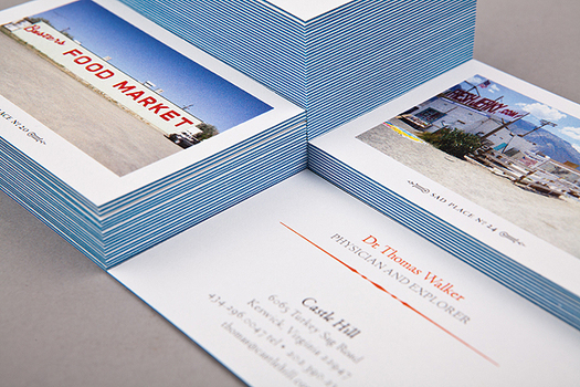 De Amerikaanse vormgever Sean Adams ontwierp in opdracht drie series, gelimiteerde oplagen visitekaartjes. De meest opzienbarende set was die met afbeeldingen van vervlogen Amerikaanse idealen op de achterzijde. Hij zegt in een interview in Imprint over deze kaartjes: “Het overhandigen van een visitekaartje is een daad van optimisme. Het geeft aan: dit ben ik en ik wil je leren kennen. Ik hou ervan optimisme en hoop te combineren met het tegenovergestelde. Deze kaart vraagt van de ontvanger een reactie en dat is de taak van een visitekaartje. Probeer dat maar eens te bereiken met een contactverzoek via LinkedIn.”