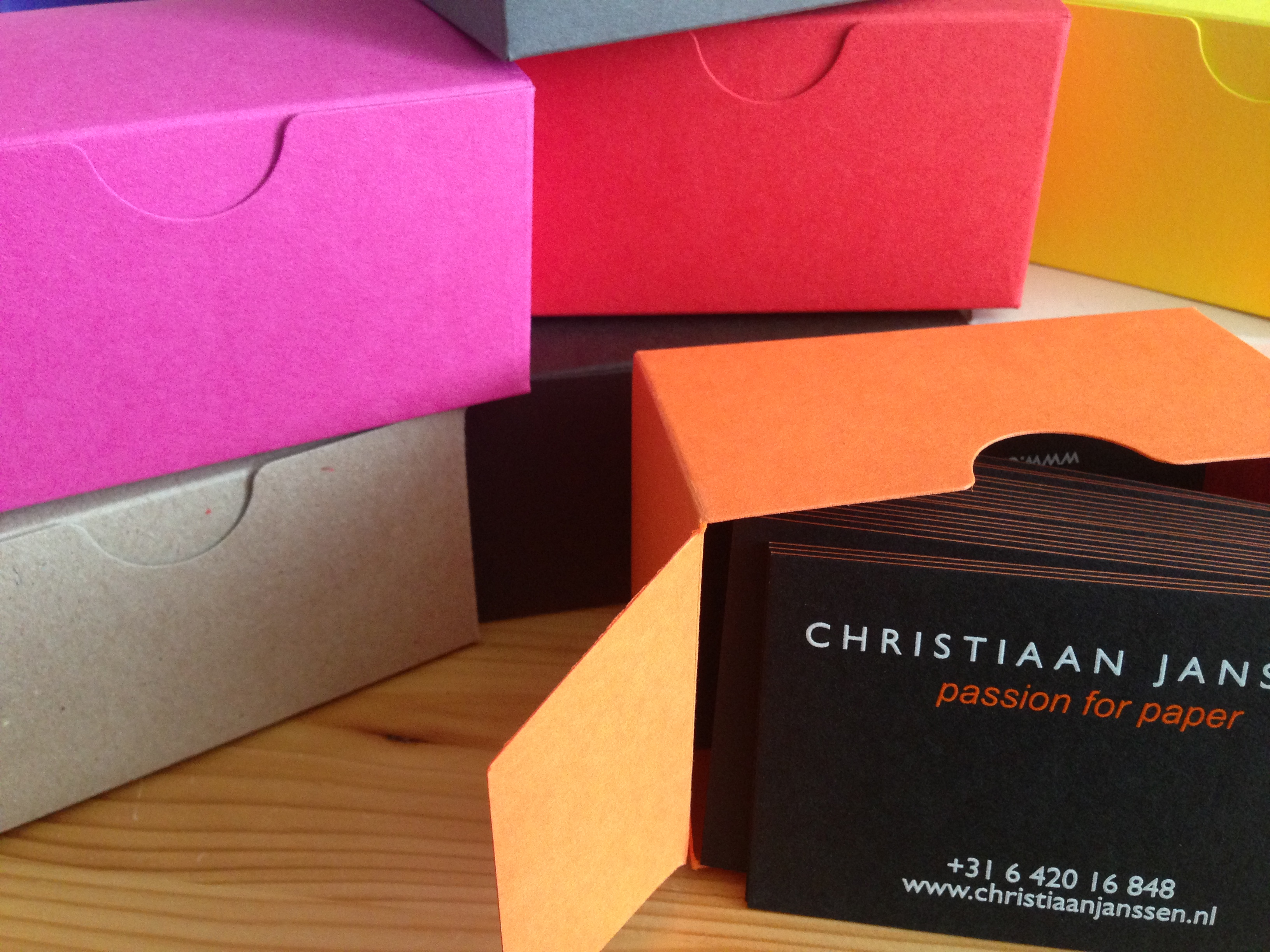 Ik vind dat dat niet past bij de mooie kaartjes die we maken. Vaak op Colorplan, Crane of Cairn Eco. Daarom ontvangen klanten vanaf nu de bestelde kaartjes in een van de kleurrijke Colorplan of Cairn Eco doosjes. Je mag ook nog de kleur kiezen: Colorplan 270 grams in Factory Yellow, Mandarin, Bright Red, Fuchsia Pink, Bitter Chocolate of Dark Grey; of in Cairn EcoKraft 430 grams of Cairn Straw White 320 grams.