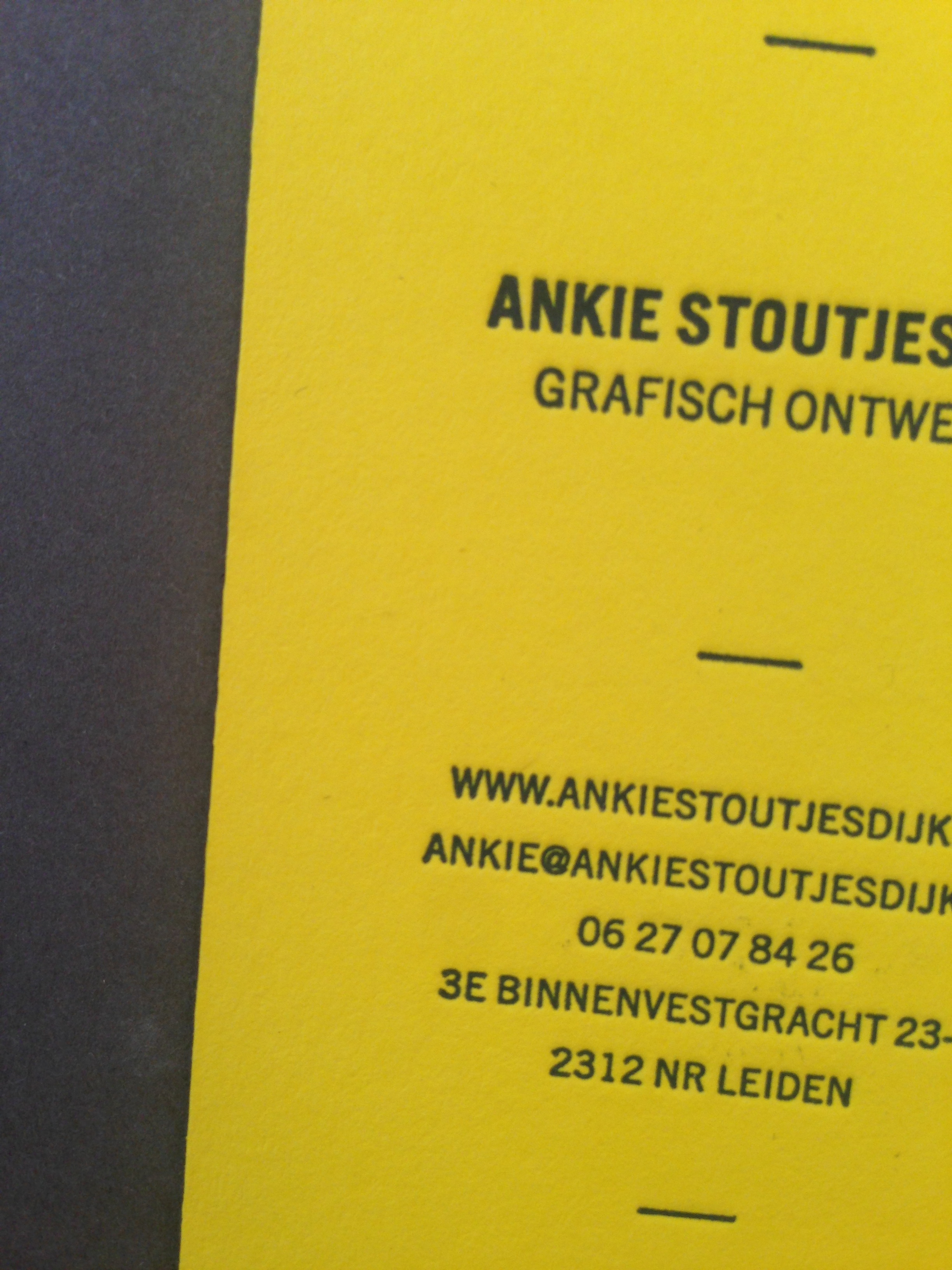 Ankie Stoutjesdijk grafisch ontwerp in Leiden was helemaal onder de indruk van de kleur Factory Yellow uit het Colorplan programma. Een heerlijk, helder gele tint (nee, niet die van de brouwer) die uitnodigt voor vrolijke uitingen. “Of Colorplan ook in letterpress gedrukt kan worden?” was de vraag. Natuurlijk kan dat; kom maar kijken hoe we dat doen. Drukkleur: donkerblauw. Op een gele ondergrond is dat oppassen. Als eindresultaat wil je diep donkerblauw en geen groene mix van het gele papier en de blauwe transparante inkt.