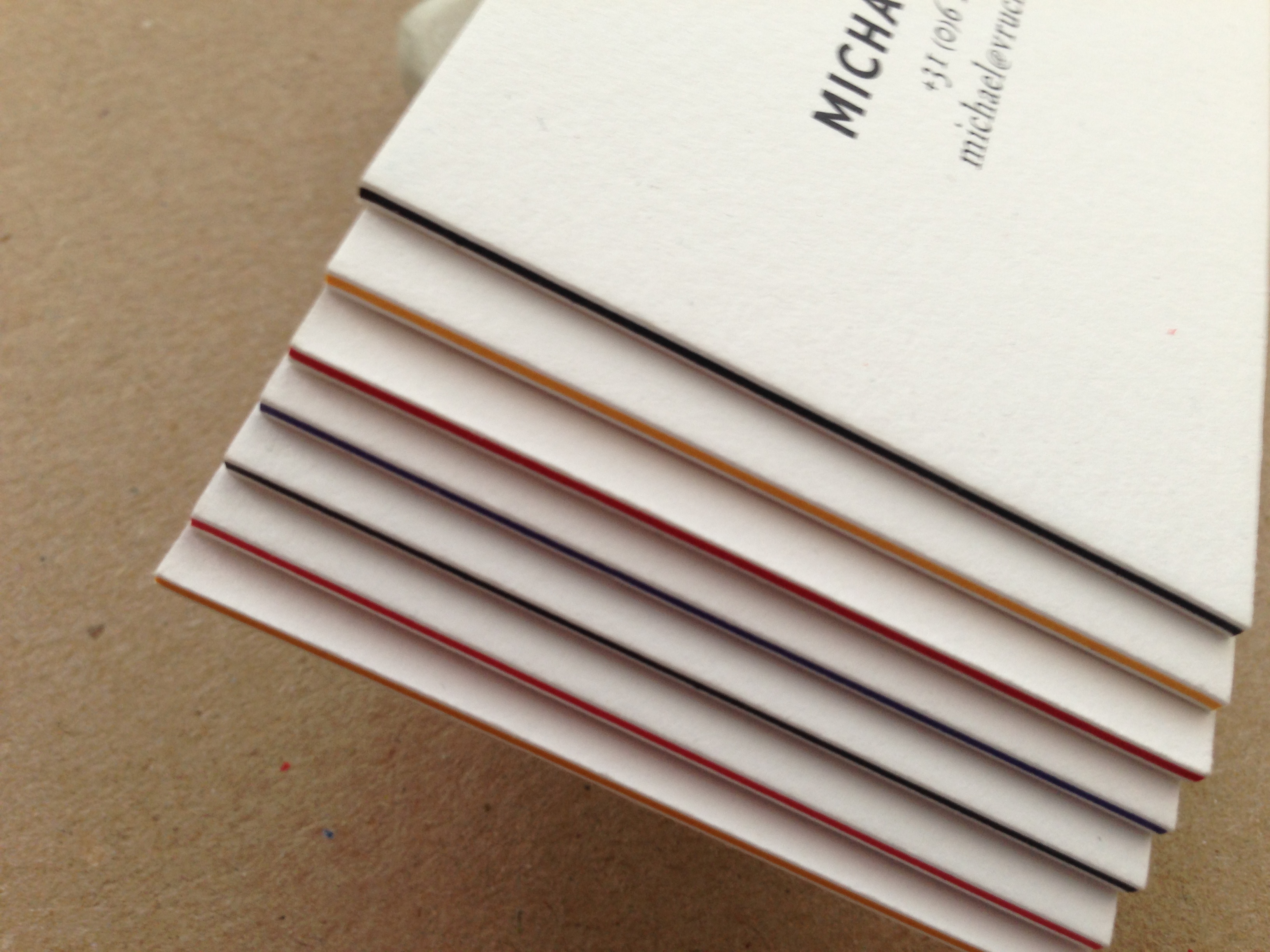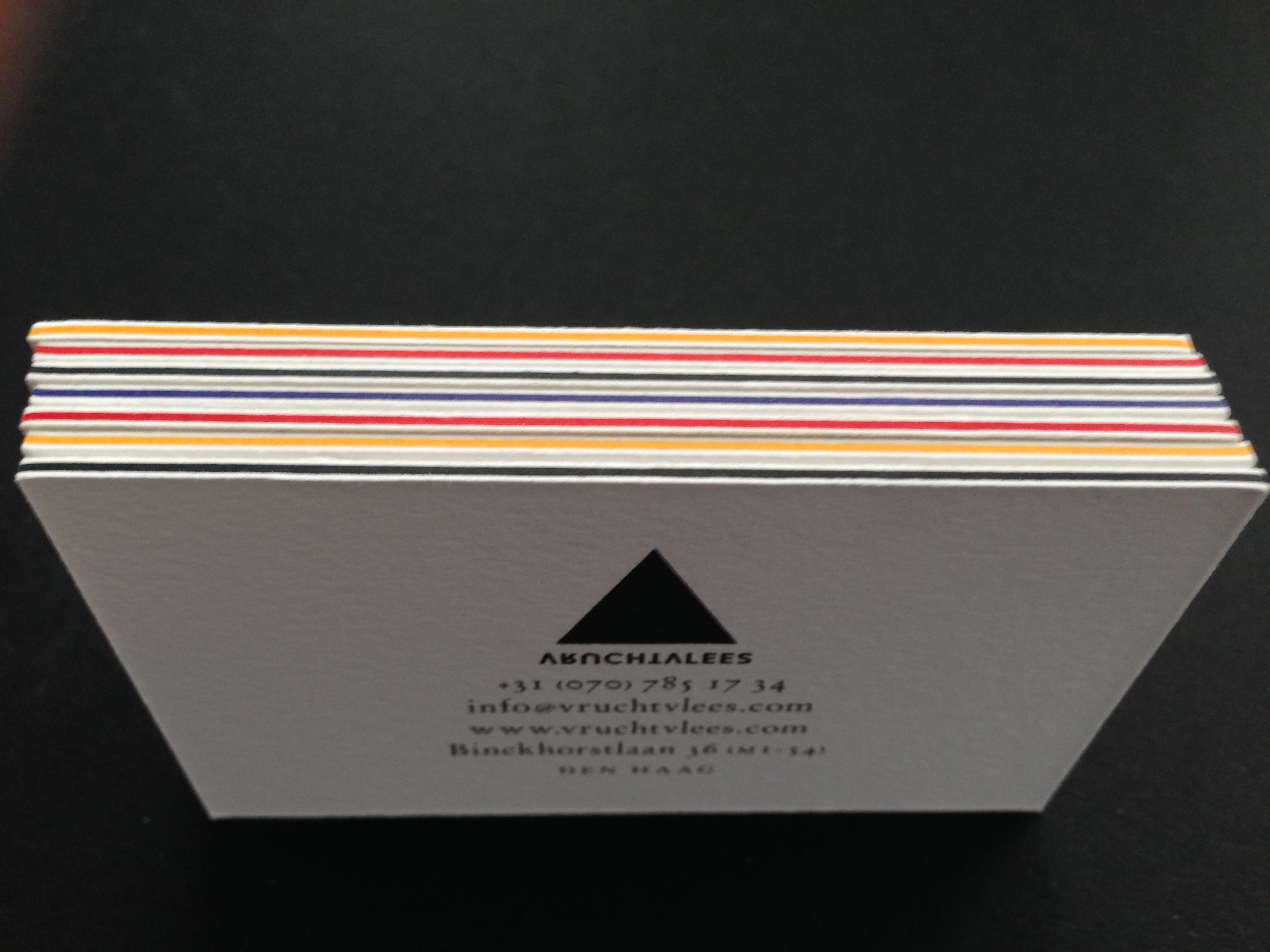 Vruchtvlees Den Haag staat voor heldere visuele communicatie. Voor hun eigen visitekaartjes kozen ze een bijzondere combinatie van Wit-Kleur-Wit waarbij de kleuren werden ingevuld door 4 kleuren uit het Colorplan programma. In plaats van het vooraf cacheren van het papier, werd gekozen voor het basispapier in een lager gramgewicht. Dat kan zonder enig probleem in offset bedrukt worden en daarna gecacheerd worden.
