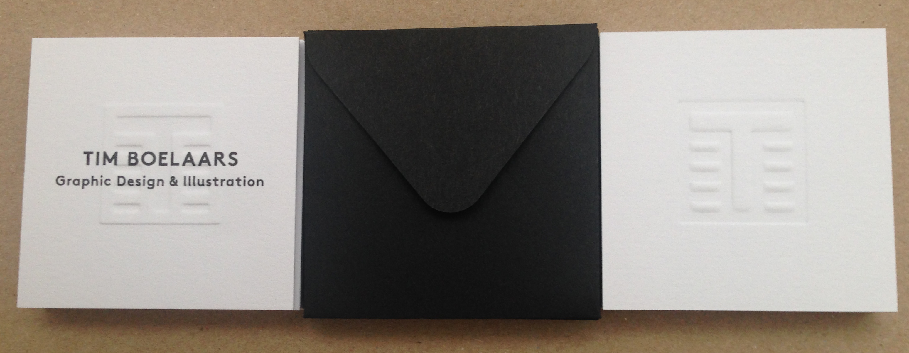 Grafisch ontwerper en illustrator Tim Boelaars uit Amsterdam wilde een vierkant kaartje met een blindpreeg die ook aan de achterzijde voelbaar en zichtbaar zou zijn.