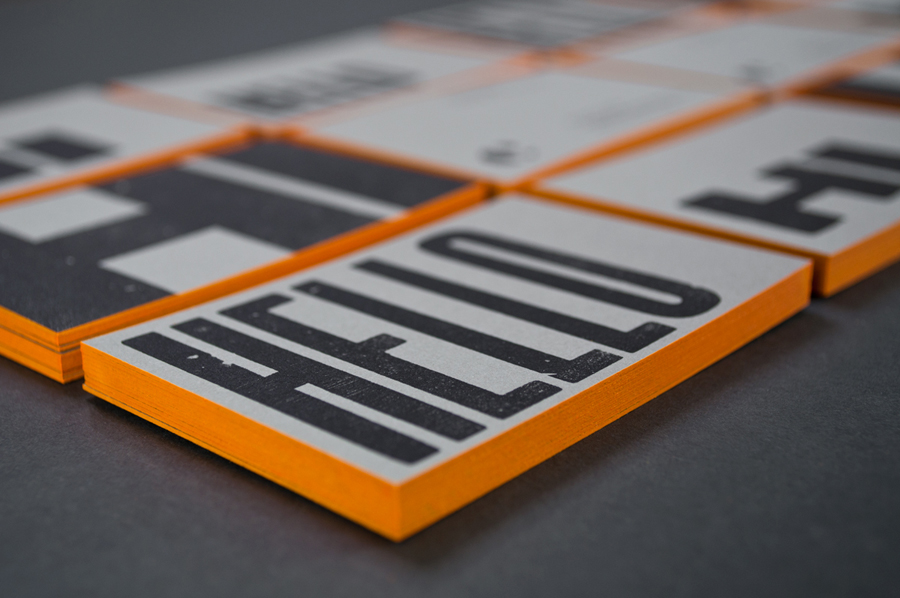 De voorzijde van de kaartjes is met de hand gezet in een 8 punts Plantin en heel veel wit. Voor de achterzijde werd gebruik gemaakt van houten letters waaraan duidelijk te zien is dat ze een heel leven achter zich hebben. Een authentieke begroeting in Hello of Hi met soms de rafeligheid van de letters.
