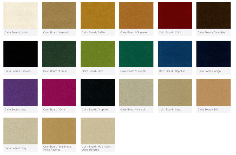 Cairn Board wordt voor 100% uit kringlooppulp samengesteld. 14 tinten, van Vanille wit tot Charcoal zwart met een heerlijk tactiel oppervlak. In 325, 455 en 630 g/m2. Geschikt voor alle grafische toepassingen en leverbaar vanaf 5 vel.